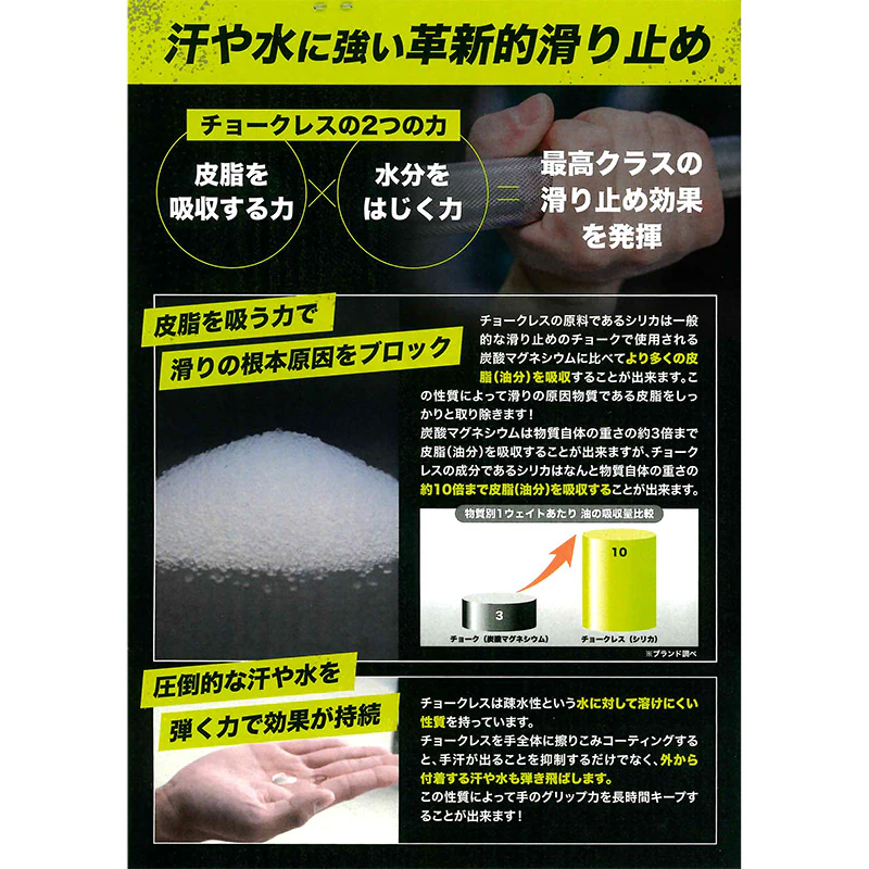 チョークレスは、滑り止めを必要とする全ての人のために開発された滑り止め。 チョークレスの驚異的なグリップ力は、粒状に加工したパウダー「モンスターパウダー」によって生み出されます。 モンスターパウダーは皮脂を吸収し、水を弾く革新的な技術により驚異的なグリップ力を発揮。 手につけた瞬間から効果を最大限発揮できるのも特徴のひとつです。 こちらは手軽に持ち運べるサイズの8グラム入りボトルです。 ボトル1本で約40回分の利用が可能となっています。 【使用方法】 乾いた状態の手に適量を取り細かい粒が無くなるまですり潰しながら伸ばしてご利用下さい。 ご使用後は石鹸などで簡単に洗い流せます。