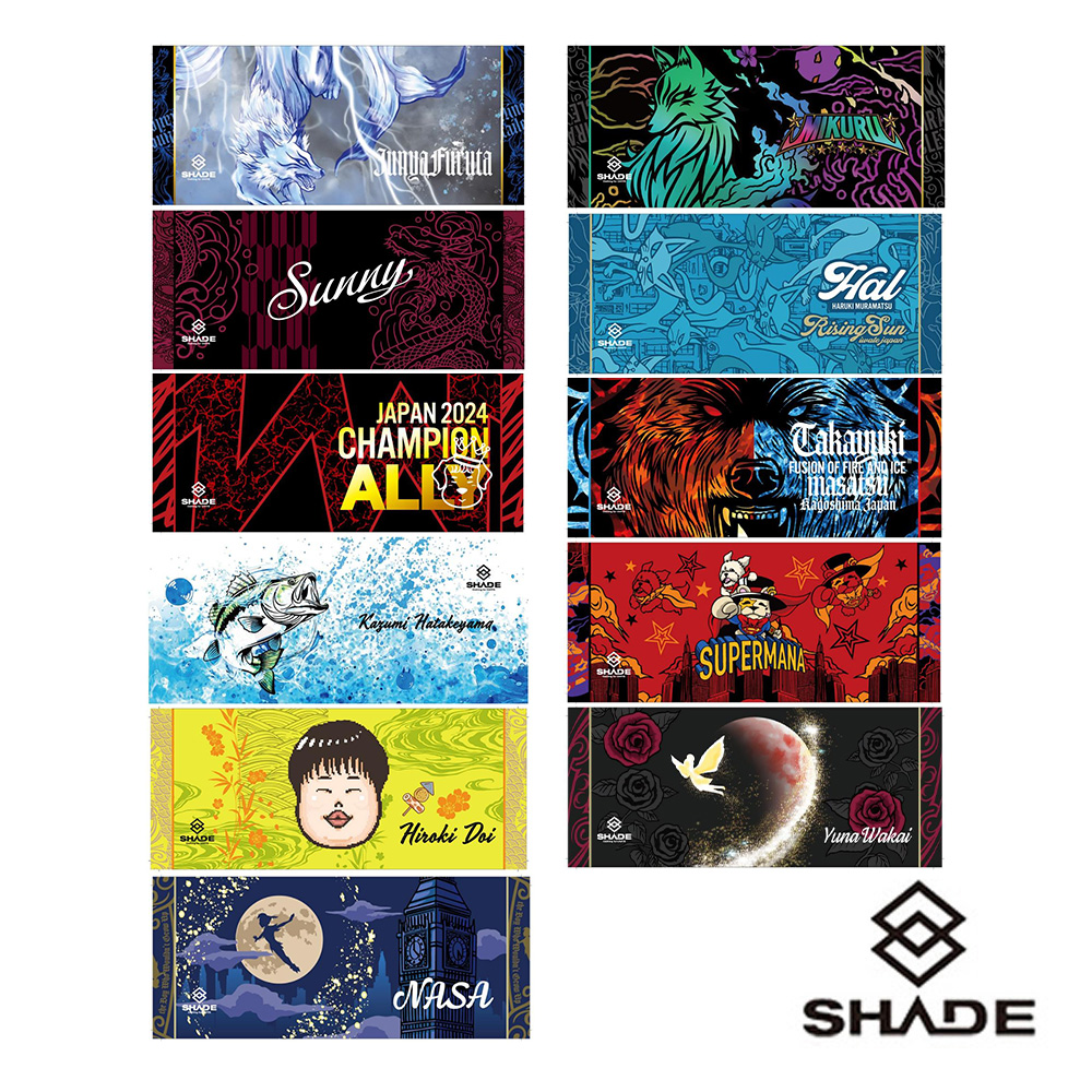 SHADE プレイヤー達それぞれの個性が光るデザインのフェイスタオル。 素材:表(印刷面)/ポリエステル、裏/綿 サイズ:H34.0cm×W85.0cm