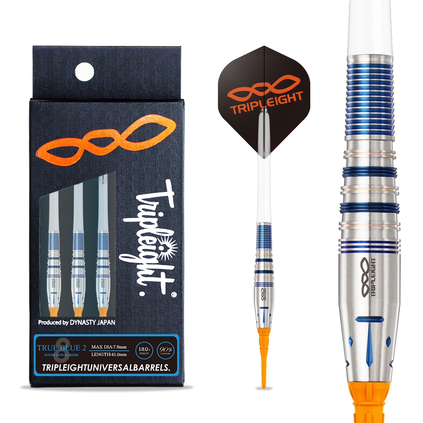 前作の軽快なトルピードを基盤に、さらなる飛びと安定性を追求した第二章。 最大径7.8mmのワイドサイズに設計を変更し、しっかりとしたテーパーでリリースの安定感を強化。 メイングリップ部はカットピッチを広げ、掛かりの強いフィーリングと攻撃的な飛びを両立。 バレルエンドには繊細なウイングカットを配置し、コントロール性能も兼ね備えた。 鮮烈なブルーを基調に、Pink Goldの3本ラインが輝きを添える。 “TRUE BLUE”の名にふさわしい、信念を貫くプレイヤーのための新たな相棒が完成。 ■スペック 素材 : Tungsten90% 全長 : 41.0mm 最大径: 7.8mm 重量 : 18.0g(バレル単体) ■セット内容 Shaft: LARO Tip : Premium Lip Point Flight: Dee.flight