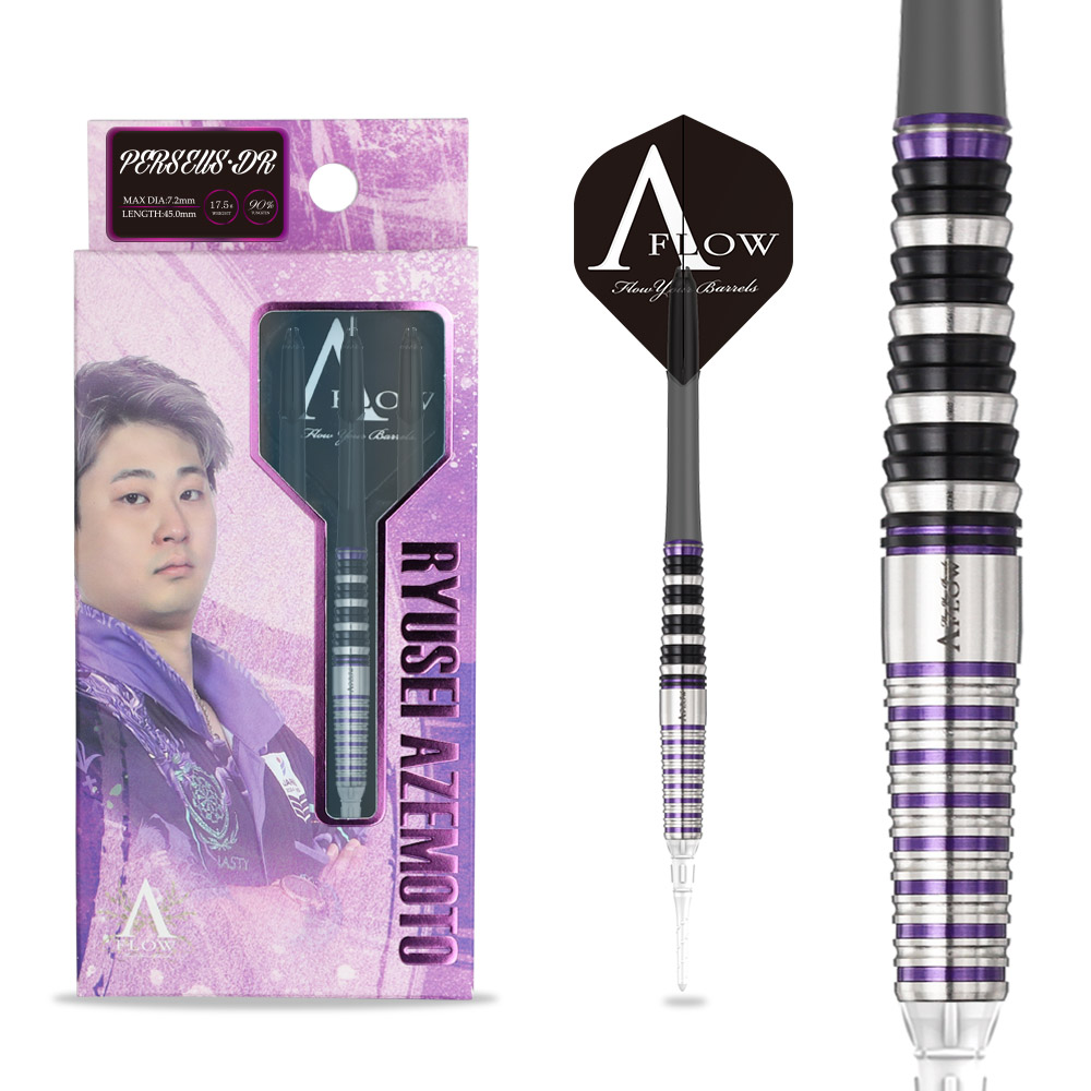 状況を読み、最適な一投を選び抜く。 畦元隆成 選手が導き出した“デュアルフォーム” "PERSEUS・DR"が登場!! 【A-FLOW "PERSEUS・DR"AZEMOTO RYUSEI MODEL】 細部まで完成されていたPERSEUSに、ウイングカットという新たな“呼吸”を与えた。 フロントラインを強化することで、より積極的な攻めのリリースへ。 気温や湿度、フィーリングのわずかな違いをも制するための第二形態。 試合会場やコンディションに応じて、“PERSEUS”と“PERSEUS・DR”を使い分ける。 精密な軌跡を描くPERSEUS、そして鋭く躍動するPERSEUS・DR。 2つのモデルを併用することで、常に最良の感覚を維持し続けることができる。 畦元隆成が求めたのは、勝利を積み重ねるための“選択肢”。 感覚を研ぎ澄ます者のための第二形態 “PERSEUS・DR”が完成。 ■スペック 素材 : Tungsten90% 全長 : 45.0mm 最大径: 7.2mm 重量 : 17.5g/19.0g(バレル単体) ■セット内容 Shaft:LARO Tip:Premium Lip Point Flight:Dee.flight