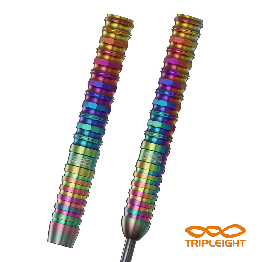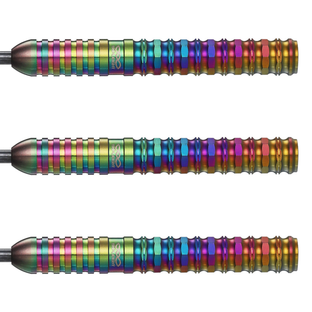高硬度・高耐摩耗性を誇るDLC Rainbowコーティングを施しタングステン95%を採用したNoxia新章。 ファーストモデルの完成度はそのままに、重量を増し、その存在感をさらに昇華。 50mmのロングストレートのリアエリア全面へ施されたナットとダブルナットが、指先に確かなグリップと鋭い飛びをもたらす。 フロントにはシンプルなリングカットを配し、王道の操作性を残しながらも、全体を重厚なデザインに。 ブラック×ブルーの衝撃から、今作は“DLC Rainbow”という新たな表情へ。 光の角度で変化する多彩な輝きが、高梨明日果選手の持つ華やかさと強さを象徴する。 圧倒的グリップ。圧倒的存在感。 進化した「Noxia」? Rainbow95が誕生。 スペック 素材 : Tungsten95% 全長 : 50.0mm 最大径: 6.5mm 重量 : [2BA]21.0g / [STEEL]24.0g(ポイント含む) セット内容 Shaft: LARO Tip : Premium Lip Point Flight: Dee.flight