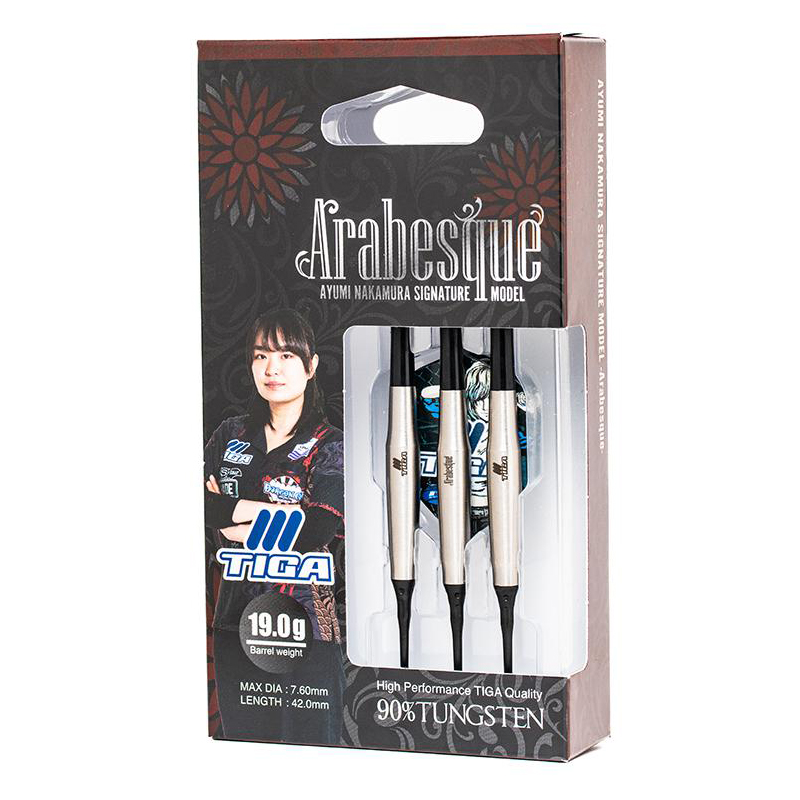 中村歩実選手のファーストモデル「Arabesque」が登場。 選手の希望により実現したノーグルーヴのバレルは、TIGAの現行ラインナップでも唯一の存在です。 メイングリップ位置となるリア側は、テーパーとアールで構成された指にフィットするデザインに。 フロント側はセンターの最大径からチップにかけてシャープに絞りました。 単体重量は19.0gと少し重めに設定、重心位置は可能な限り後ろに調整し中村選手の飛びをサポートします。 バレルの重みとアウトラインで飛ばせるバレルです。 バレル名は中村選手が17年取り組んでいたバレエの技から採用し「幾何学的に無限に広がる」という意味を持つもの。 「Arabesque」は貴方の可能性を無限に広げます。 ■スペック 材質:90%タングステン 単体重量:19.0g 全長:42.0mm 最大径:7.6mm