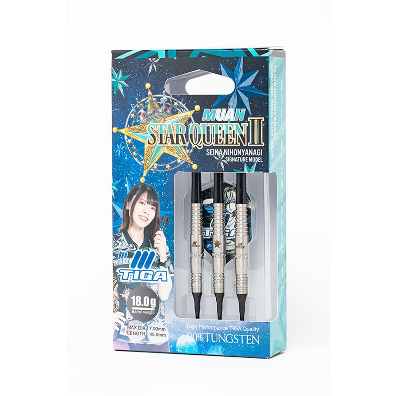 『進化した、新たな輝きをあなたの手に』 神奈川を拠点にJAPAN LADIES へ参戦し、YouTube 等でもマルチに活躍する二本柳星奈選手のセカンドモデルが登場。 今作では選手のグリップに合わせて全体的に構成を見直し、ひし形の形状をベースに、力をダイレクトに伝えやすいアウトラインを採用。 メインカットはウイングカットをベースに、ピッチを広く取ることで輪郭のハッキリとしたグリップ感を実現。 ウイングカット後方は若干の角度を付けることで、かかりすぎず抜けの良いカットになっている。 また、カットの範囲を狭くすることで、グリップ位置が安定しやすい設計となっている。 センターとフロントには「星」をイメージしたデザインカットを施し、レーザー刻印による『STAR QUEEN』モチーフが煌びやかで存在感のあるビジュアルを演出している。 ■スペック 素材:タングステン90% 全長:45.0mm 最大径:7.0mm 重量:18.0g