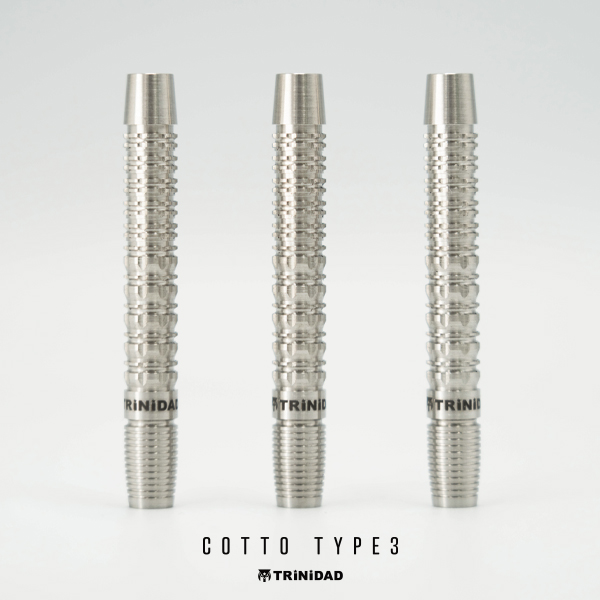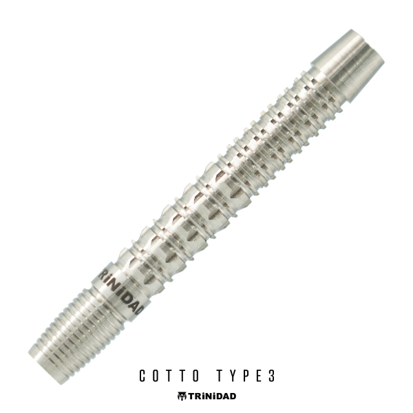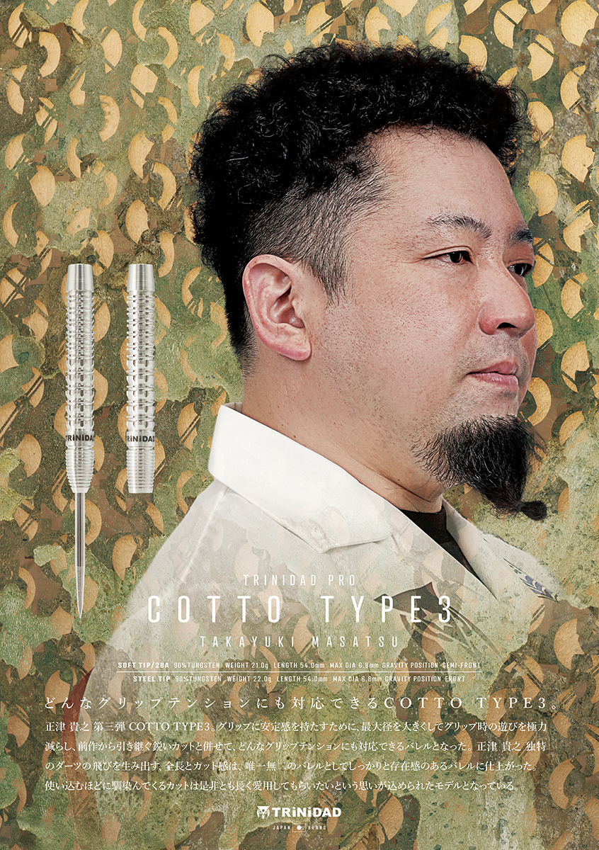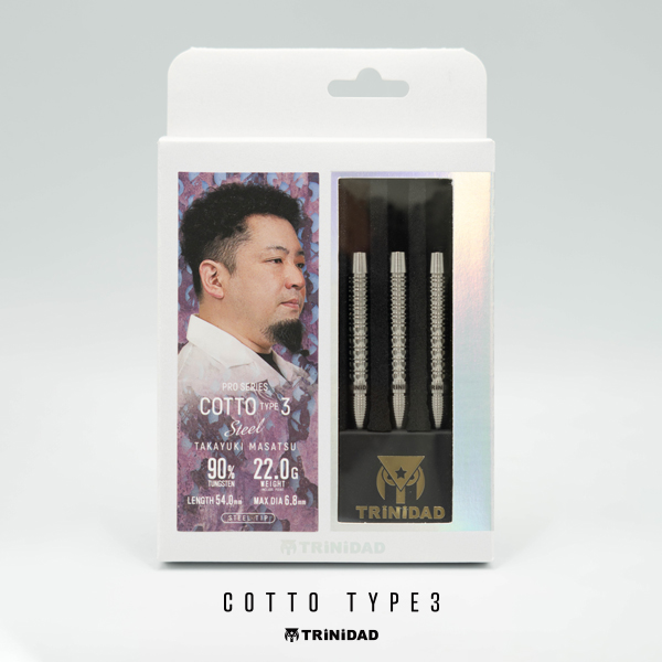 どんなグリップテンションにも対応できるCOTTO TYPE3。 正津 貴之選手 第三弾 Cotto Type3。 グリップに安定感を持たすために、最大径を大きくしてグリップ時の遊びを極力減らし、 前作から引き継ぐ鋭いカットと併せて、どんなグリップテンションにも対応できるバレルとなっています。 正津選手独特のダーツの飛びを生み出す、全長とカット感は、唯一無二のバレルとしてしっかりと存在感のあるバレルに仕上がっています。 使い込むほどに馴染んでくるカットは是非とも長く愛用してもらいたいという思いが込められたモデルになっています。 ■スペック [SOFT/2BA] 素材:90%Tungsten 重量:21.0g 全長:54.0mm 最大径:6.8mm 重心:セミフロント [STEEL] 素材:90%Tungsten 重量:22.0g(ポイント含む) 全長:54.0mm 最大径:6.8mm 重心:フロント ■セット内容 バレル:3本 フライト:3枚 シャフト:3本 CONDORティップ:3本(2BAタイプのみ) ※付属品のフライトやシャフト・ティップの色は写真と異なる場合があります。 ※バレルのロゴの色はモニタの環境により、実物と異なる場合がございます。予めご了承ください。
