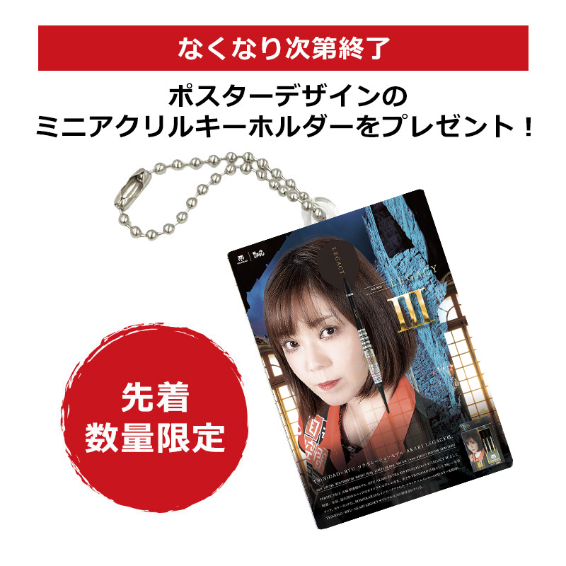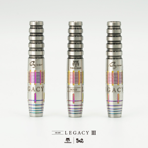 TRiNiDAD×RYU AKARI LEGACY3。 PERFECT女王 大城 明香利選手モデル、RYU AKARI EXTRA3をTRiNiDADコラボ「LEGACY3」として復刻。 全長、最大径のスペックはオリジナルモデルのまま、重さをTRiNiDAD仕様として20gへ重量アップ。 TRiNiDAD・RYU・AKARI LEGACYオリジナルロゴが刻印されています。 ■スペック 素材:90%Tungsten 重量:20.0g 全長:40.0mm 最大径:7.4mm 重心:セミフロント ■セット内容 バレル:3本 フライト:3枚 シャフト:3本 CONDORティップ:3本 ※付属品のフライトやシャフト・ティップの色は写真と異なる場合があります。 ※バレルの色はモニタの環境により、実物と異なる場合がございます。予めご了承ください