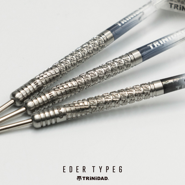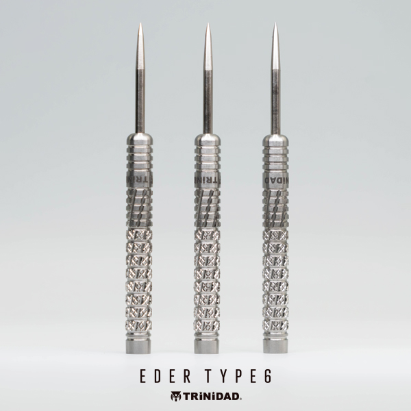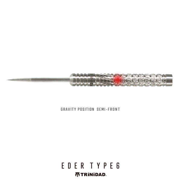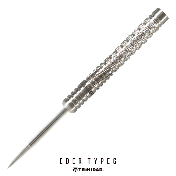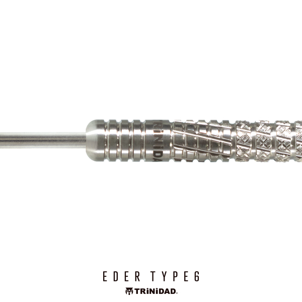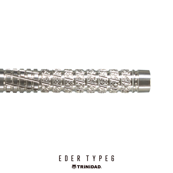 しっかりとした掛かりによって安定したリリースを可能に。EDER TYPE6。 シンプルなリングカットに、縦方向のスパイラルカットを組み合わせたモデル。 シリーズの特徴であるローレットカットもメイングリップ部に施されており、しっかりとした掛かりによって安定したリリースが可能になっています。 全体として効きの強いカット構成でありながら、最大径6.2mmのストレート形状により、軽やかなスローイングを実現。 ソフトモデルは全長48.0mm・重量18.5gのライトな設計、一方でスティールモデルは全長51.0mm・重量22.5gとし、より力を伝えやすいスペックに仕上げています。 ■スペック [SOFT/2BA] 素材:90%Tungsten 重量:18.5g 全長:48.0mm 最大径:6.2mm 重心:センター [STEEL] 素材:95%Tungsten 重量:22.5g(ポイント含む) 全長:51.0mm 最大径:6.2mm 重心:セミフロント ■セット内容 バレル:3本 フライト:3枚 シャフト:3本 CONDORティップ:3本(2BAタイプのみ)