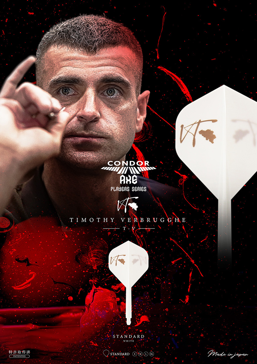 21世紀の新素材と言われる特殊樹脂を使用した硬質CONDORフライト。 その新素材を100%活かす量産方法に改善、更にネジ形状を大幅に改良。 Timothy Verbrugghe選手デザインのCONDOR AXE! ■特徴 ・バネの様な弾性力 0.4mm極薄仕様の羽部分。 指で潰しても元に戻り完璧な90度を保ちます。 ・いまだかつてない弾力性、桁違いの耐久性 ・従来のCONDORより重い CONDOR:1.42g CONDOR AXE:1.60g ※Small Lで計測/1本のみの重さ ・フライトがぶつかる心地よい音 更に、シャフトが硬いので、従来のCONDORとは、また違う狙い方が可能に。 ■スペック フライト形状(カラー):スタンダード (ホワイト) シャフトサイズ:S / M / L / XL シャフト部分の長さ:S 21.5mm / M 27.5mm / L 33.5mm / XL 37.5mm(ネジ山含まず) 【特許取得済/PATENTED】 「CONDORの類似品が出回っております、ご購入の際はCONDORとご確認の上、ご購入ください。」 The Similar CONDOR products are now available in the market. Please check with CONDOR before purchasing.