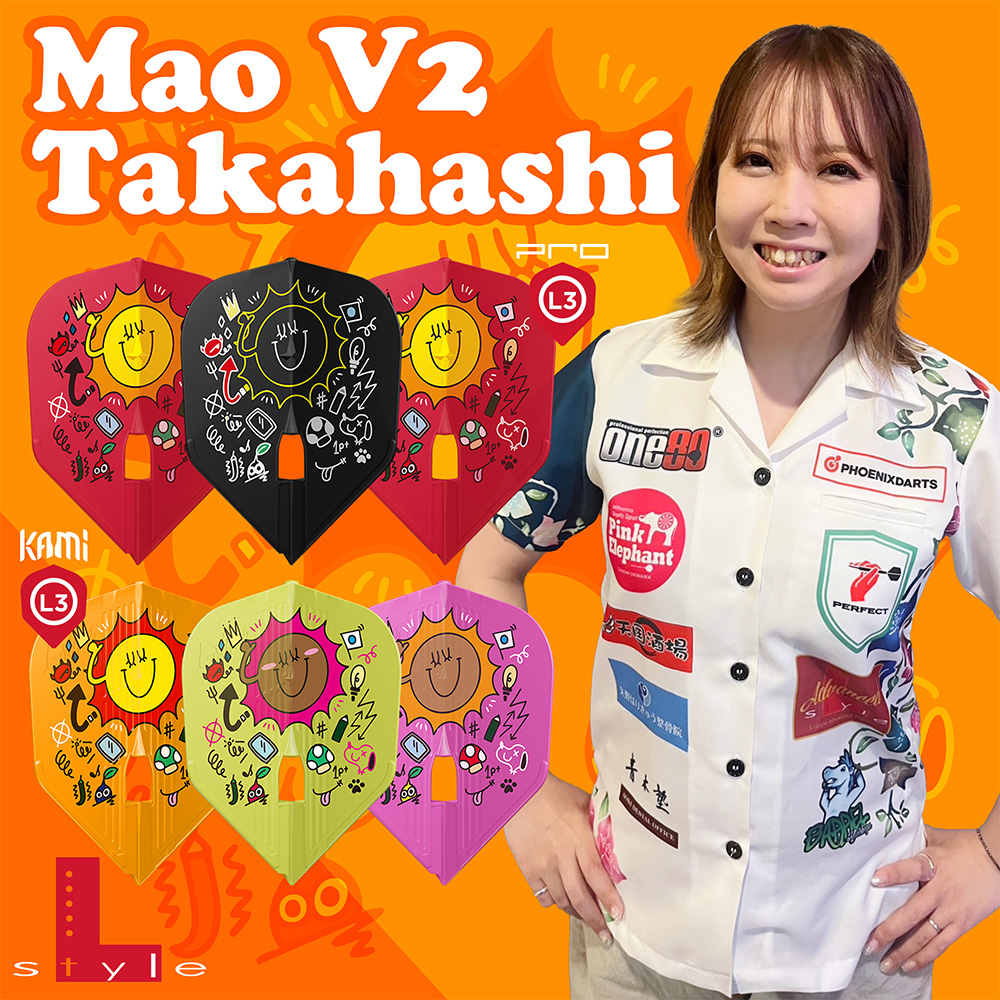 賑やかなデザインで登場するのは、高橋麻央選手(旧姓:島村)のエルフライトver.2。 高橋選手の好きなものがたくさん詰まったデザインで、ユーザーに元気を与えてくれます。 ダーツの飛びにもその元気が伝わるかもしれません。 形状:シェイプ
