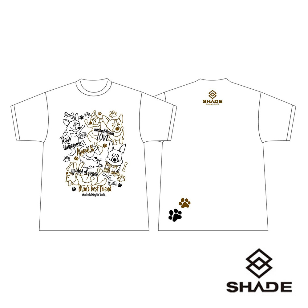 愛犬2匹をたくさん描いた犬好きには堪らない作品。 背面にはSHADEロゴと共に肉球が2つ入った。 カラー:ホワイトのみ