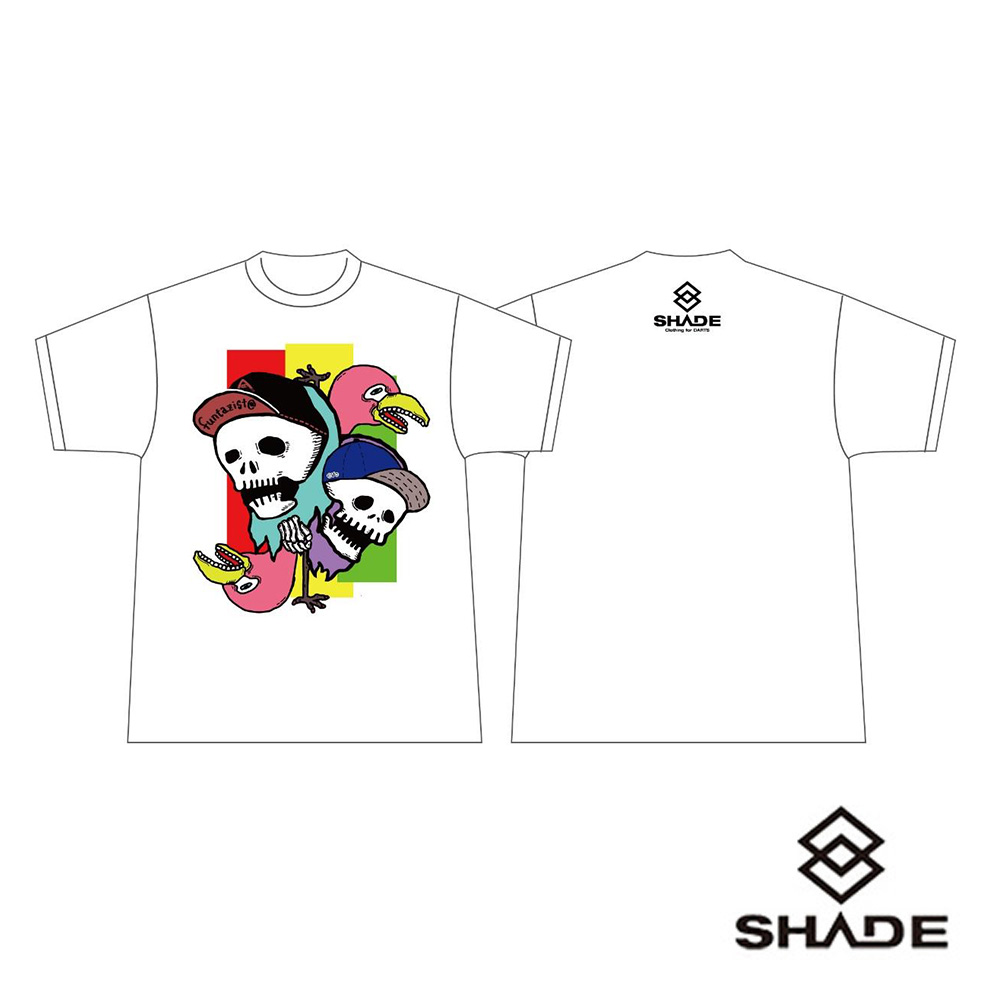 キャップを被ったドクロと、フラミンゴがゆるく可愛いデザイン。 背面はSHADEロゴ入り。 カラー:ホワイトのみ